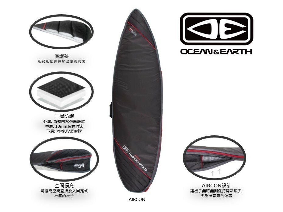 The Aircon Surfboard Cover is an Ocean & Earth classic. Incredibly sophisticated in its design, this surf board cover has shock-absorbing foam, three layers of protection and extra padding in the nose and tail. These extra safety measures mean that you can transport multiple boards without the stres